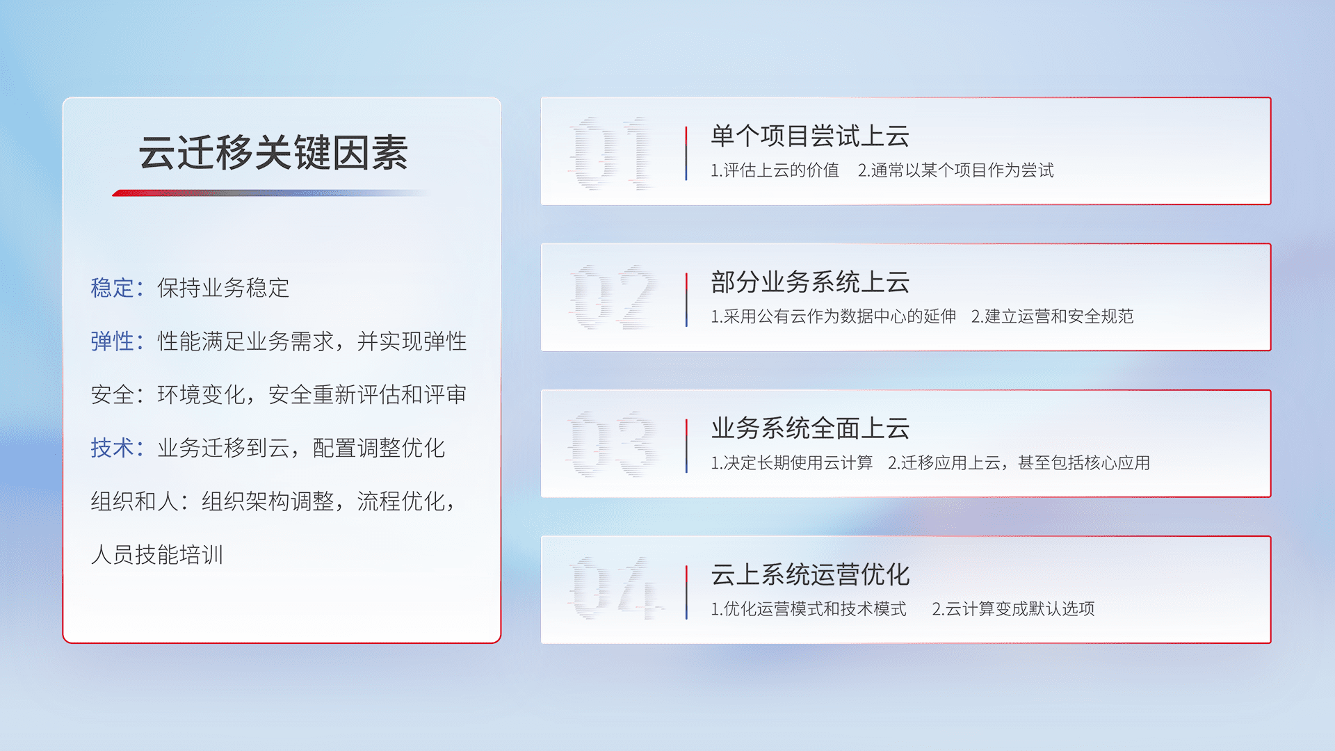 结合实际业务,,,,从规划设计、、、云平台选型、、云原生改造、、数据迁移、、集成交付,,,迁移全过程为客户识别最佳上云路径,,,做好风险识别管理,,,设计网络架构、、、、身份权限、、、、安全审计合规、、操作审计、、日志审计、、、监控告警策略、、、、多站点容灾设计等,,,,对云上基础设施进行整体规划,,,提升IT治理水平,,以满足弹性、、高可用、、、、高性能的需求。。。。