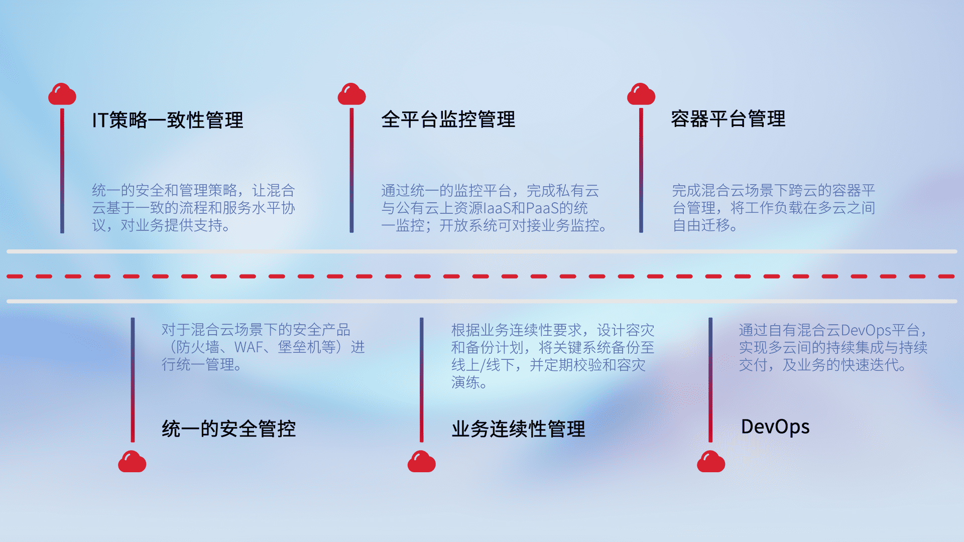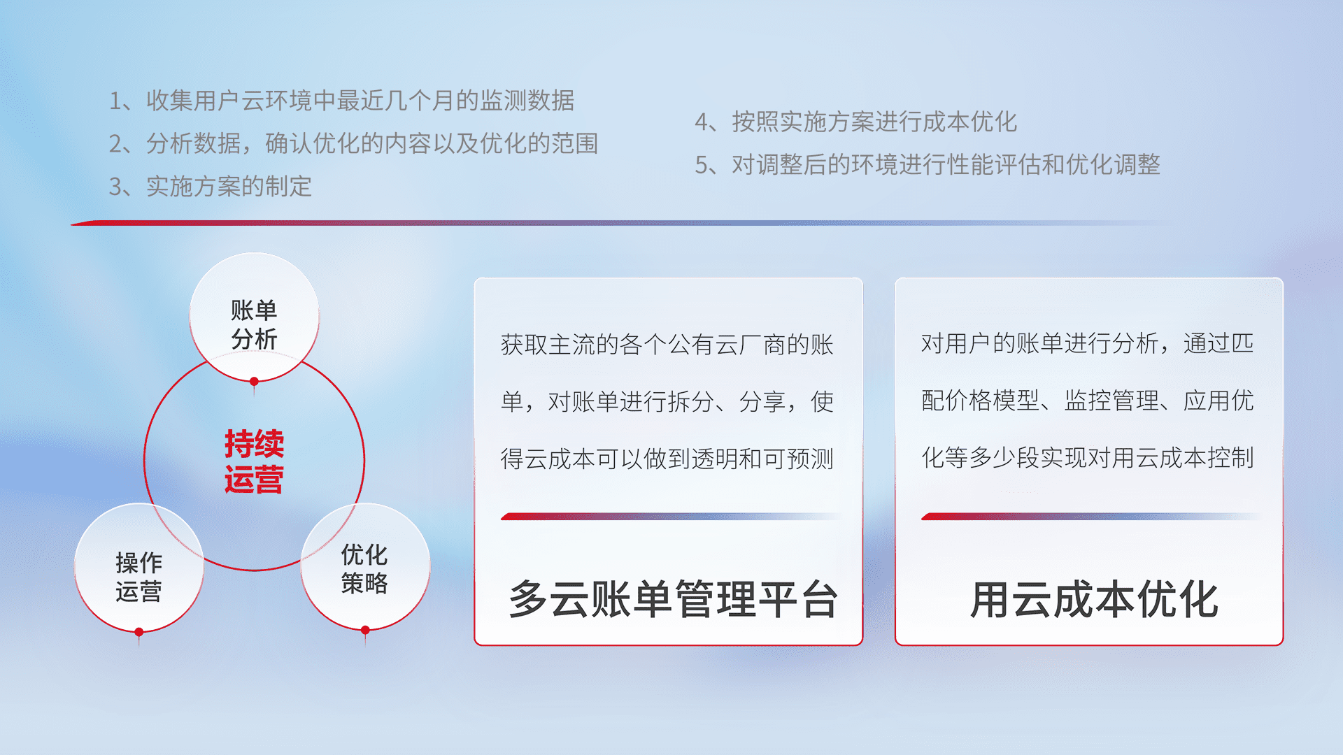 通过多云纳管,,以统一的资源数据模型把客户的云资源进行抽象和封装,,进而实现对多云资源的统一操作,,保障云资源管理的可靠性、、稳定性与可用性。。。。量身定制化运维内容,,,配置、、、、开发运维、、、补丁管理、、备份、、、、监控、、、、认证和访问管理、、审计和日常巡检等,,,保障在用云过程中的可靠度,,,,稳定度以及高可用率。。。。